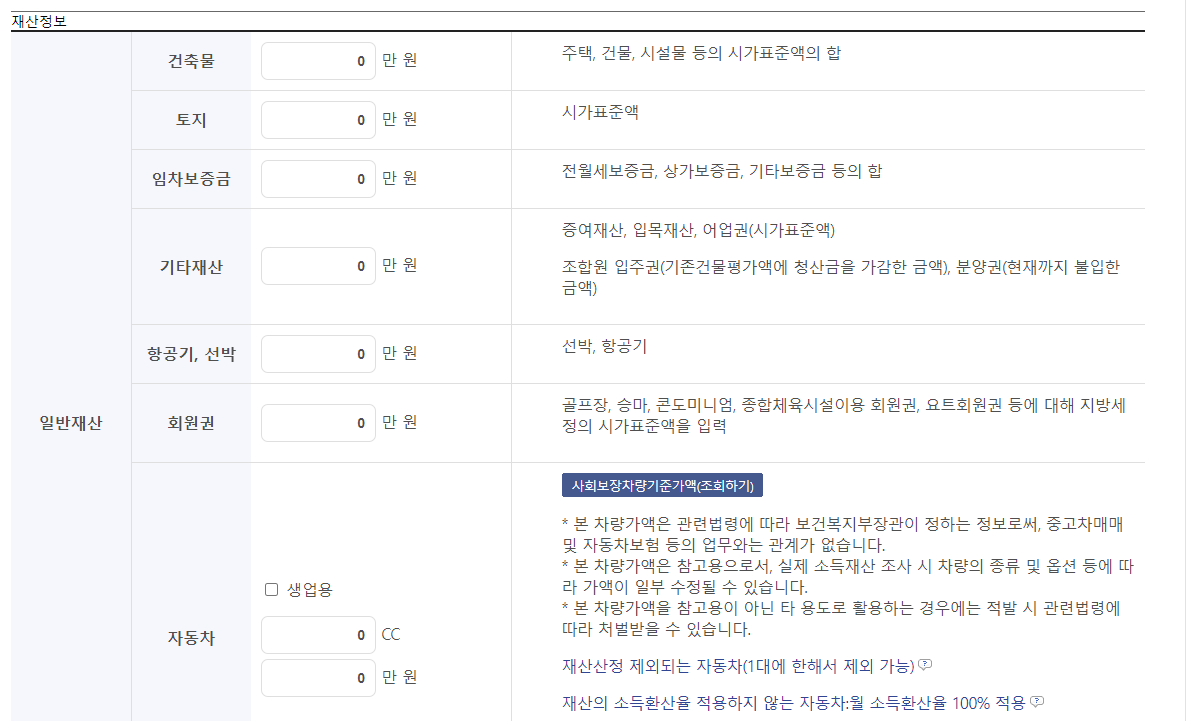 - 고급자동차 및 회원권의 가액으로 월 100%의 소득환산율을 적용합니다.