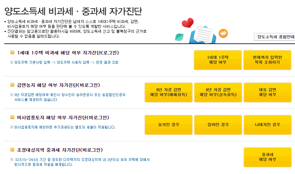 양도세 비과세 대상인지, 중과세 대상인지 확인하고 싶다면 양도세 자가진단을 통해서 판단해 볼 수 있습니다. 더불어 조정대상지역 중과세 해당 여부도 확인해 볼 수 있으니 활용해 보시기 바랍니다.